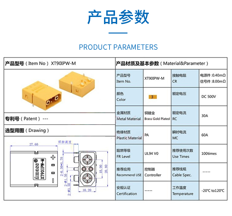 艾邁斯XT90IPW航模連接器臥式板式XT90PW(2+2) AMASS正品模型插頭