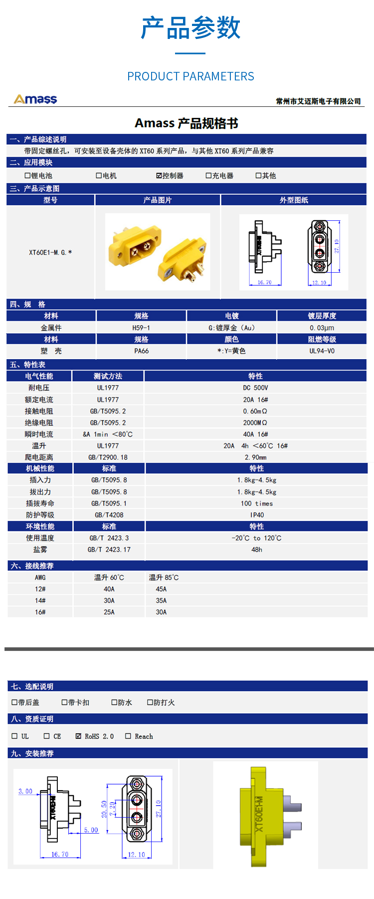 艾邁斯XT60E1-M帶M2.5螺母可固定3.5mm鍍金航模連接器