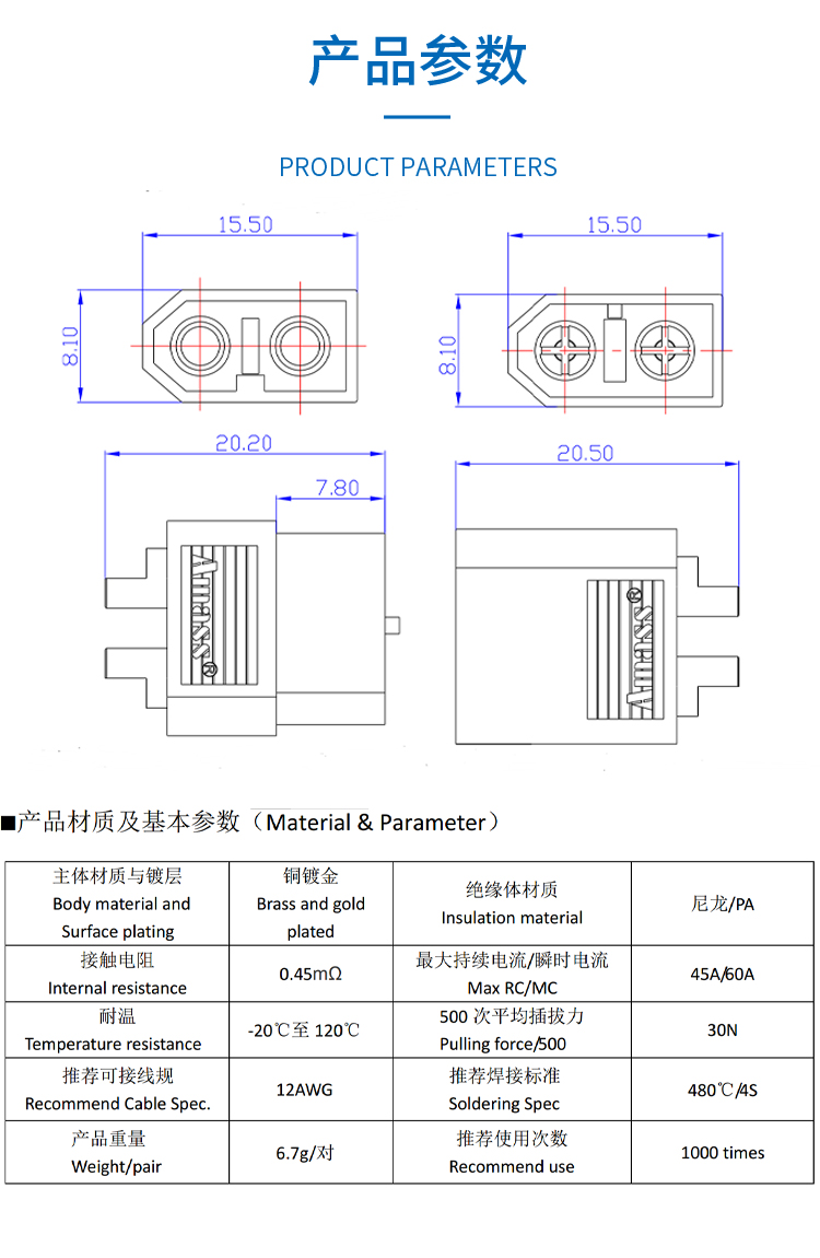 艾邁斯XT60藍(lán)色 3.5mm鍍金香蕉插頭T接口連接器AMASS熱賣模型配件