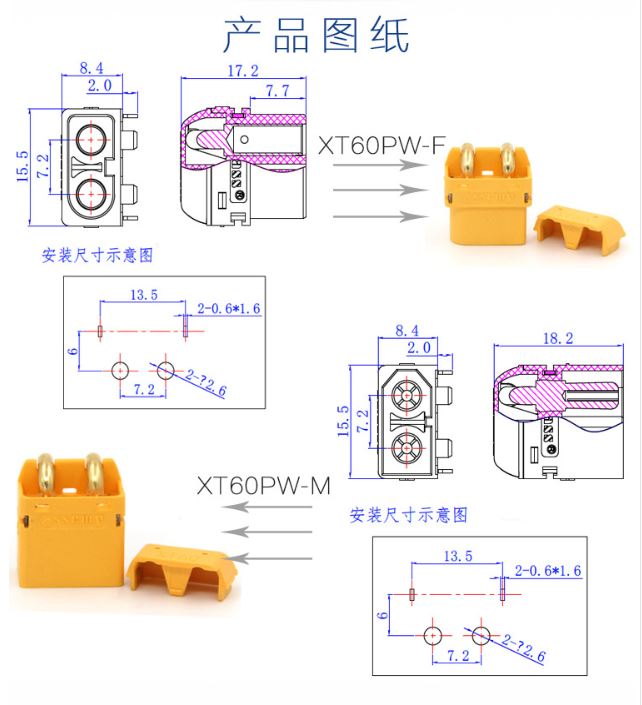 艾邁斯XT60PW連接器XT60臥式板式電路板插頭AMASS熱賣(mài)模型配件