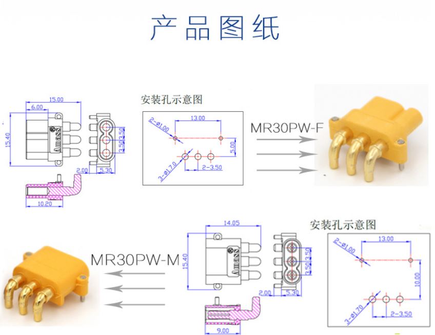 艾邁斯MR30PW直角板式臥式航模插頭XT30三芯版AMASS正品模型配件