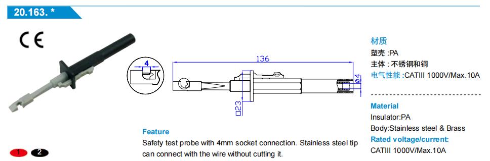 20.163 專業(yè)快速絕緣無損免破線汽車刺線線束測試夾自帶4mm插座鍍鎳AMASS