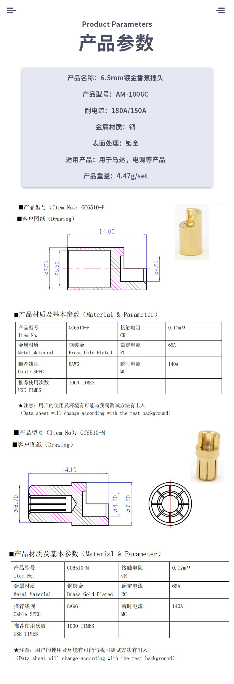 艾邁斯6.5mm香蕉插頭電機(jī)電調(diào)純銅航模連接器Amass熱賣配件GC6510